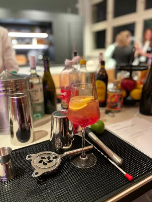 Das Highlight war das Mixen der Cocktails: Nebst dem Miss Moneypenny-Spritz mit Grenadine konnten die Mitglieder sich beispielsweise einen Amaretto Sour, einen Espresso Martini oder den Klassiker schlechthin mixen – einen Gin Tonic. Dabei geht es natürlich nicht nur um das Zusammenschütten von Zutaten, wie man es zu Hause machen würde, sondern um die richtige Handhabe der Shaker, wann wo Eiswürfel hinzugegeben werden müssen und wie man Minzblätter richtig zerstampft.