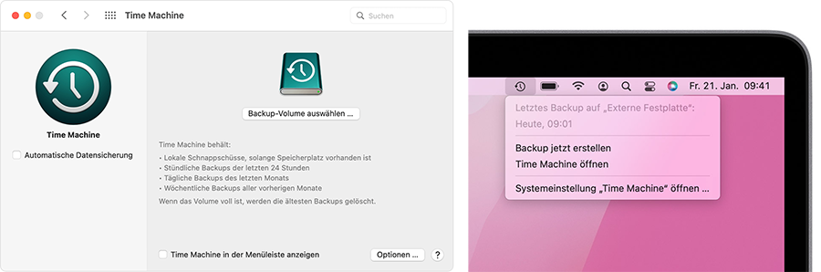 Die integrierte Backup-Funktion im Mac heisst «Time Machine». Damit lassen sich alle persönlichen Daten automatisch auf einem externen Speicher wie etwa einer kleinen Festplatte sichern. Empfehlenswert ist das besonders, wenn Sie die Dokumente nicht in Apples iCloud Drive sichern wollen. Auf diese können Sie nur mit funktionierendem Internetzugang zugreifen. Besonders heikle Dokumente, die beispielsweise Firmengeheimnisse enthalten, wollen viele auch nicht auf einem Webserver speichern.