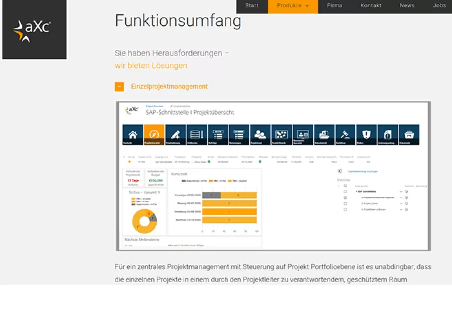 Die aXcelerate-Solutions AG aus Ziegelbrücke bietet mit axc-Project eine Plattform für das Projekt- und Ressourcenmanagement auf Basis von Microsoft SharePoint. Alle benötigten Elemente und Funktionen werden im Stil eines digitalen Baukastens zusammengesetzt. Herzstück der Lösung ist der Projektraum. Hier finden die Planung und die Steuerung des Projekts und aller Teilprozesse statt. Flexible Vorlagen helfen dabei, neue Projekte schnell aufzusetzen.